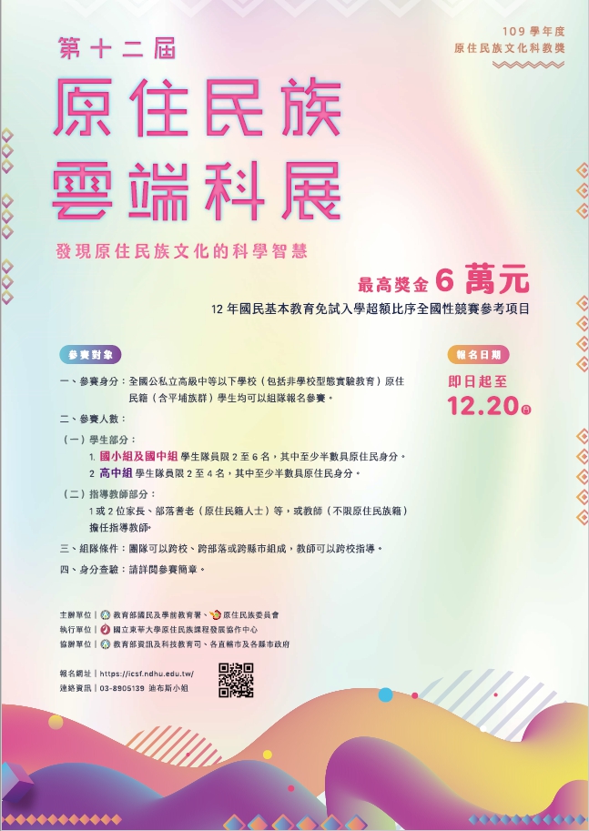 - 主旨:本署委請國立東華大學辦理「109學年度原住民族文化科教獎-第十二屆原住民族雲端科展暨原生科學家高峰營」