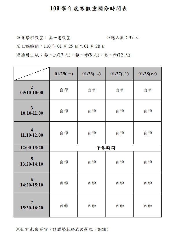 【公告】109學年度第一學期寒假重補修時間表(更新)