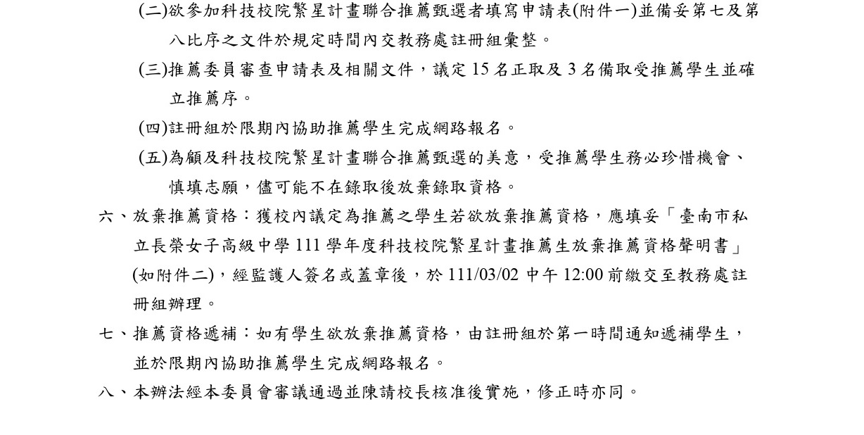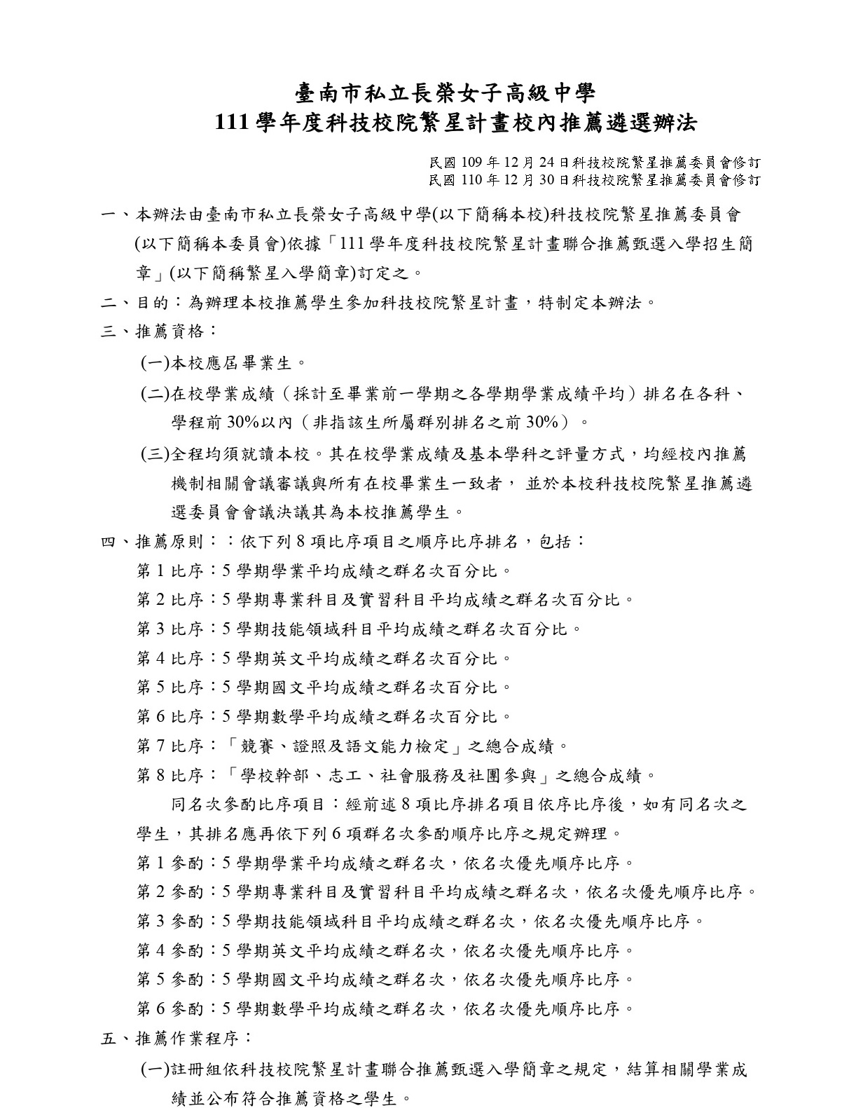 附件-111學年度第臺南市私立長榮女子高級中學科技校院繁星校內推薦遴選辦法.pdf