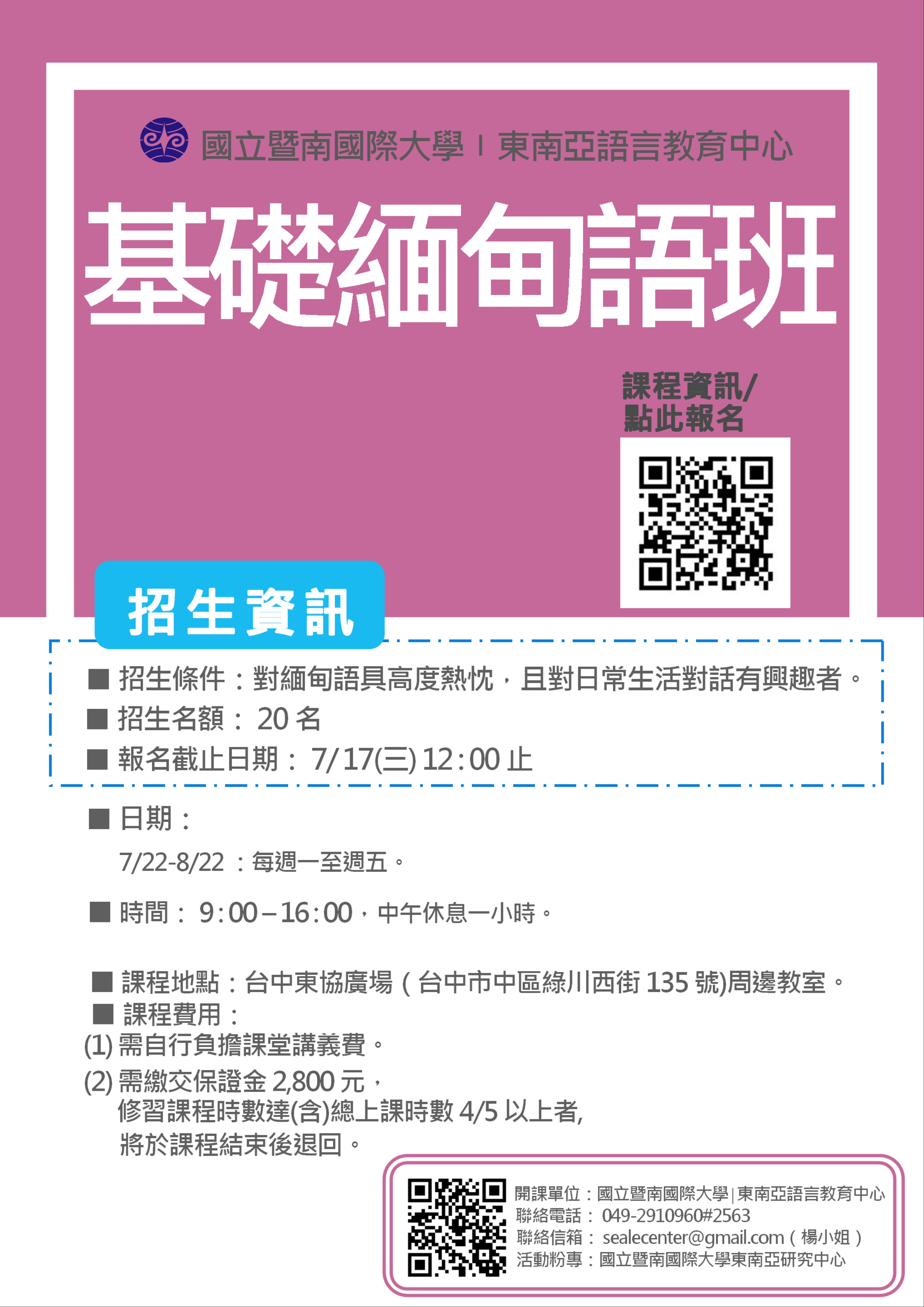【轉知】國立暨南國際大學東南亞語言教育中心辦理「108年度基礎緬甸語課程」