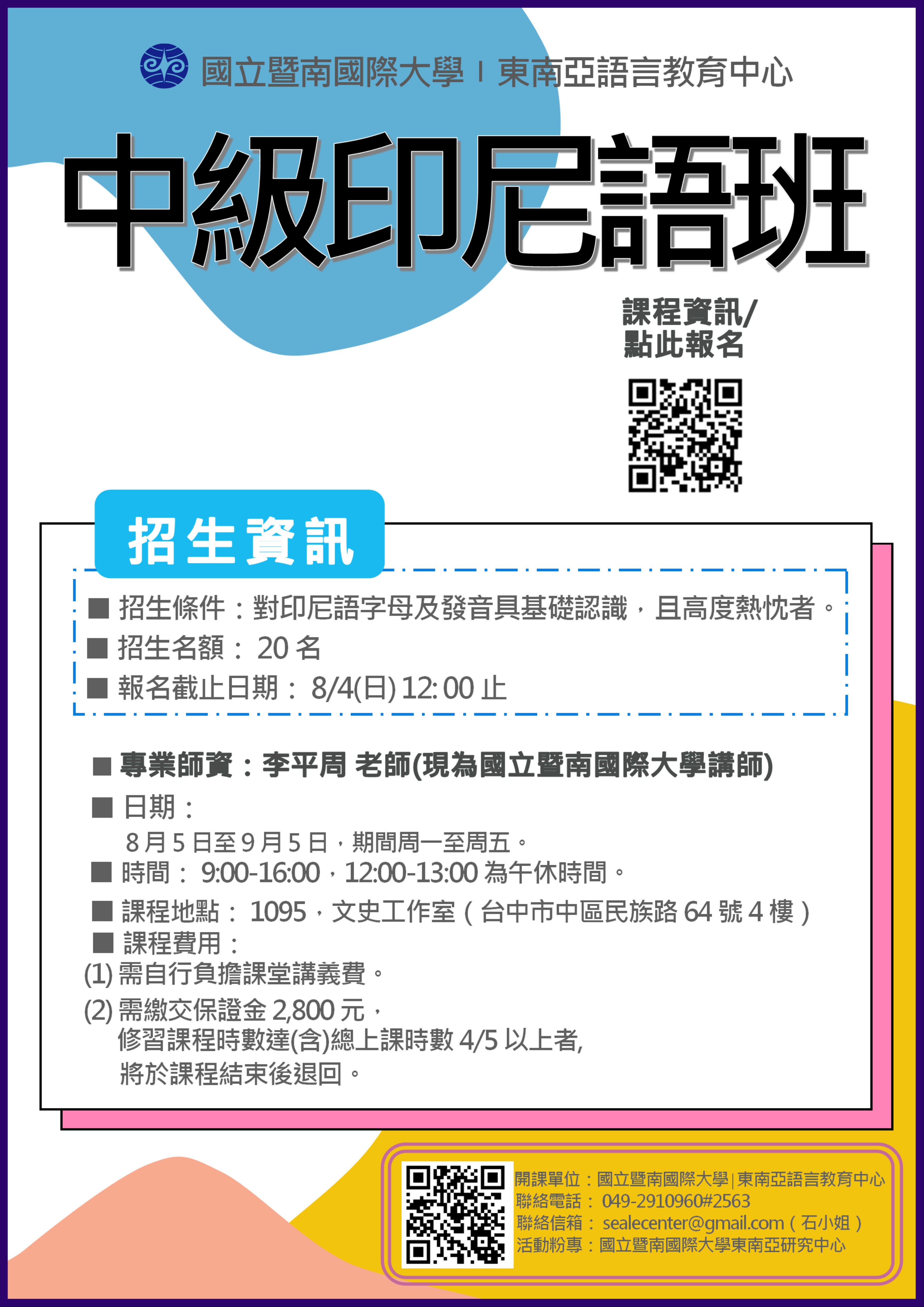 【轉知】國立暨南國際大學辦理「108年度中級印尼語課程」,請踴躍報名參加。