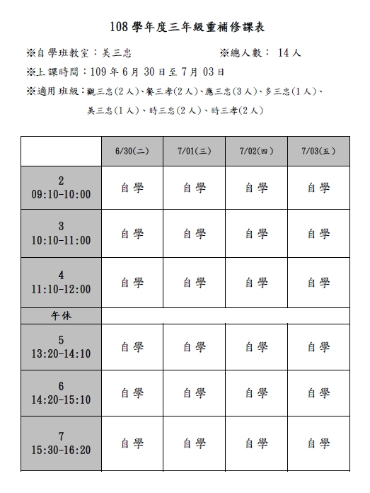 重補修時間為上午9:10-下午4:20,並統一由教務處代訂便當。