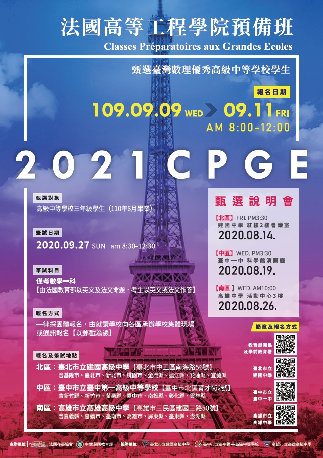 一、依據: 依據法國高等工程學院預備班(Classes Préparatoires aux Grandes Ecoles,簡稱 CPGE)甄選我國高 級中等學校數理優秀應屆畢業生實施 計畫訂定本簡章。