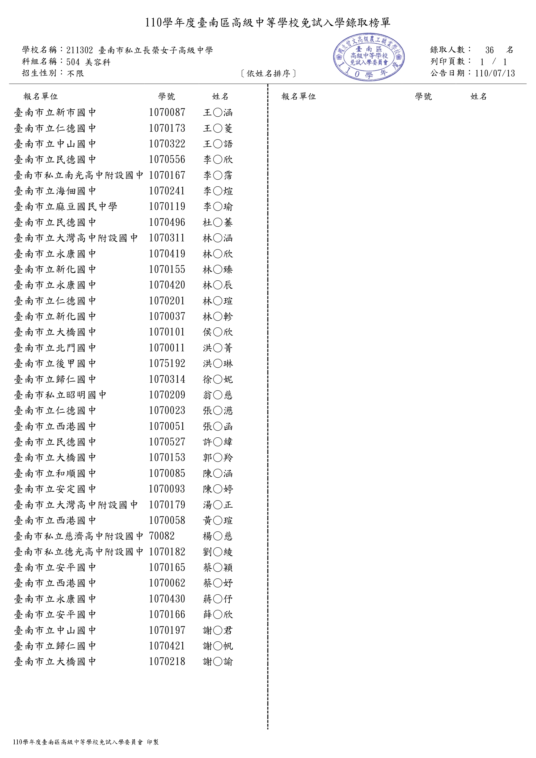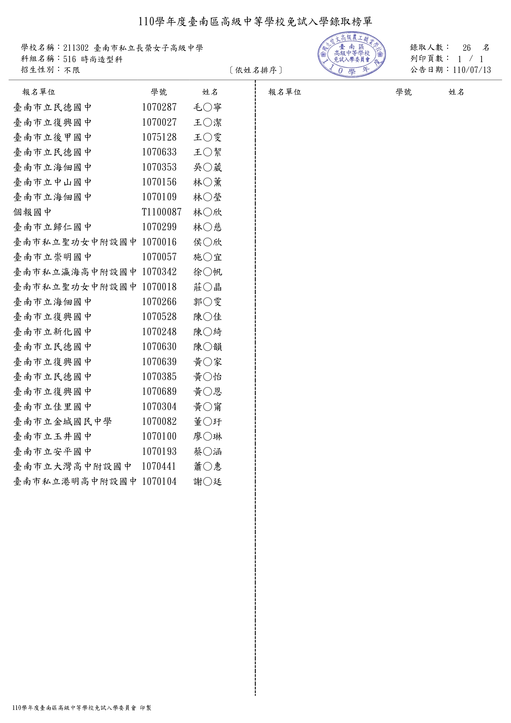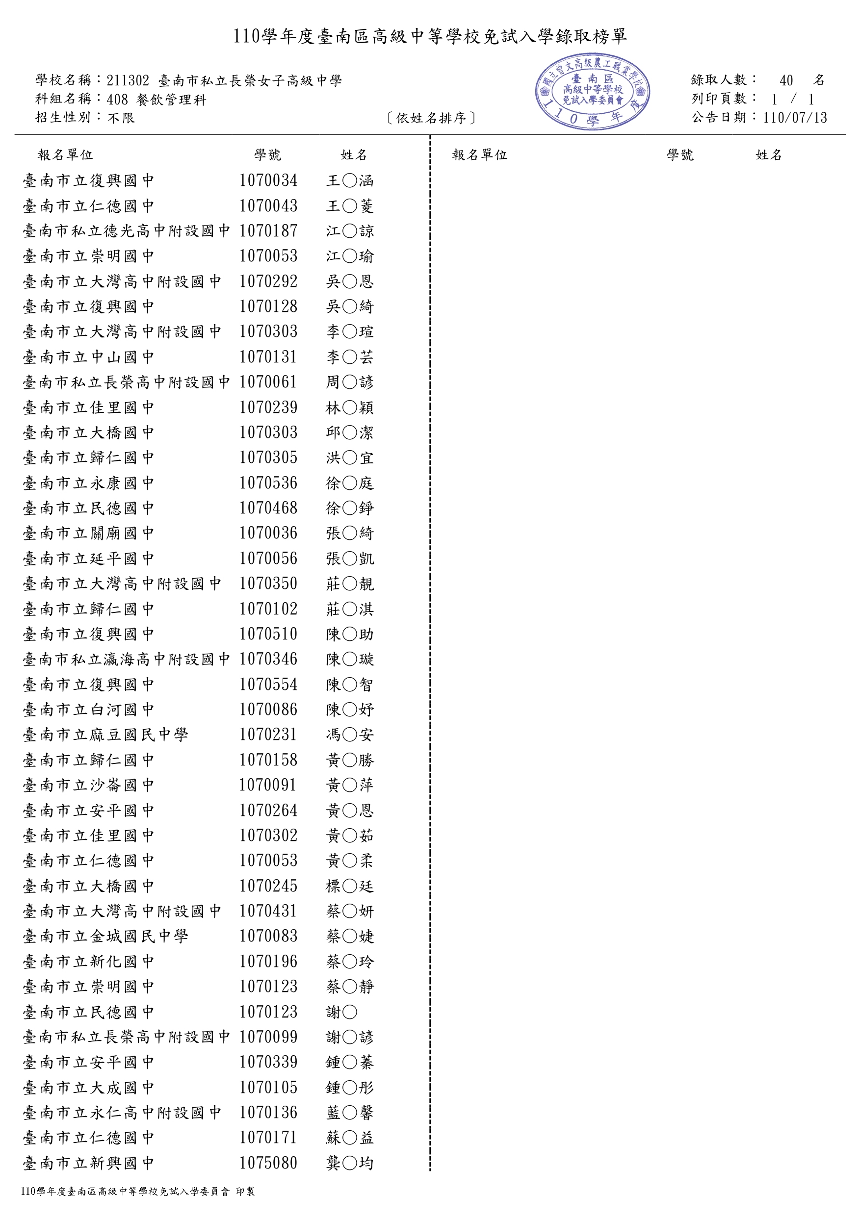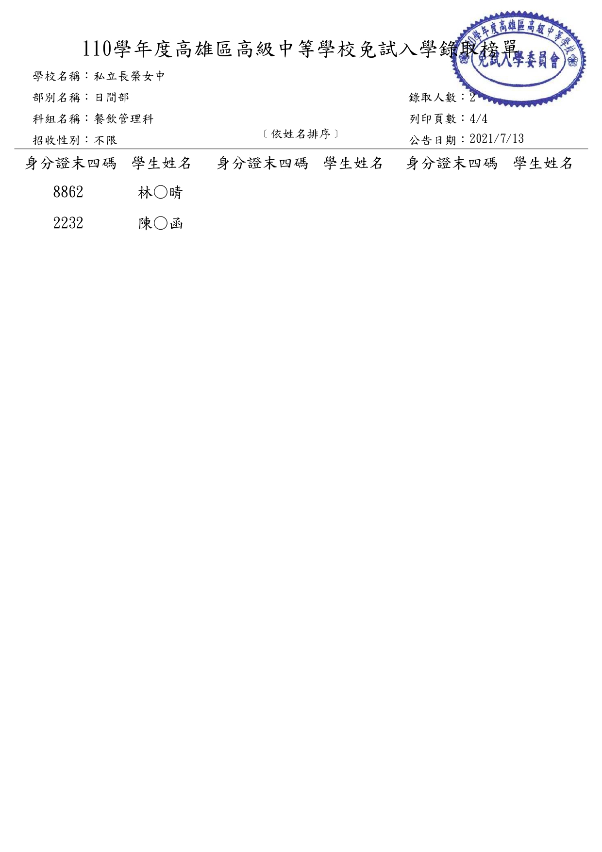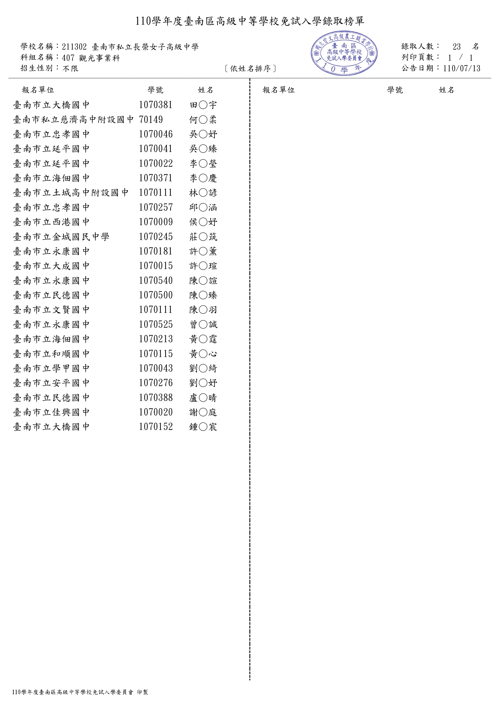 【公告】110學年臺南市私立長榮女子高級中學免試錄取榜單